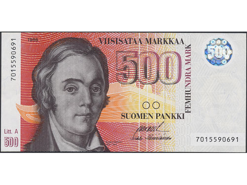 Banknotes, Finland. Pick 120, 500 markkaa 1986. 7015590691. Litt. A. 01. Banknotes, Finland. Pick 120, 500 markkaa 1986. 7015590691. Litt. A. 01. Visa mindre