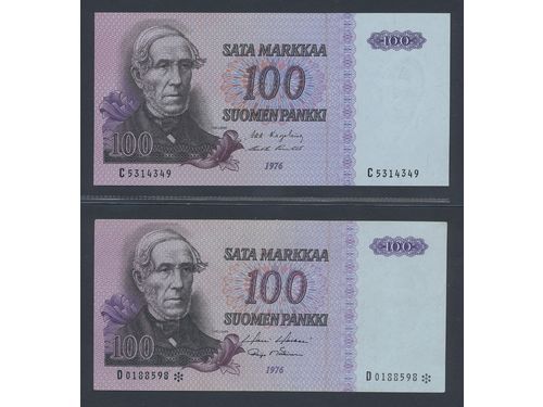 Banknotes, Finland. Pick 109a, 109r1, 100 markkaa 1976. Lot of two notes including uncirculated regular note (serial num.. Läs mer Banknotes, Finland. Pick 109a, 109r1, 100 markkaa 1976. Lot of two notes including uncirculated regular note (serial number C5314349) and replacement with centre fold (serial number D0188598*). 01-0. Visa mindre