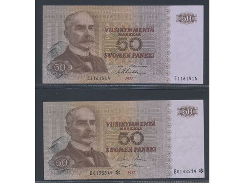 Banknotes, Finland. Pick 108a, 108r1, 50 markkaa 1977. Lot of two notes including uncirculated regular note (serial numb.. Läs mer Banknotes, Finland. Pick 108a, 108r1, 50 markkaa 1977. Lot of two notes including uncirculated regular note (serial number E1161514) and very fine example of replacement note (serial number G0138879*). 1/1+-0. Visa mindre