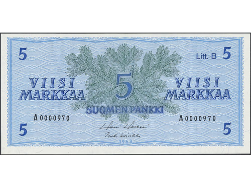 Banknotes, Finland. Pick 106Aa, 5 markkaa 1963. Litt. B. Low serial number A0000970. 01/0. Banknotes, Finland. Pick 106Aa, 5 markkaa 1963. Litt. B. Low serial number A0000970. 01/0. Visa mindre