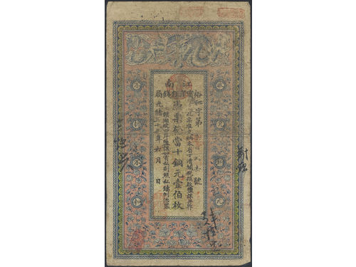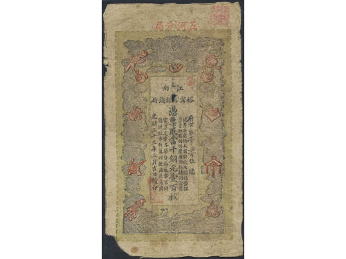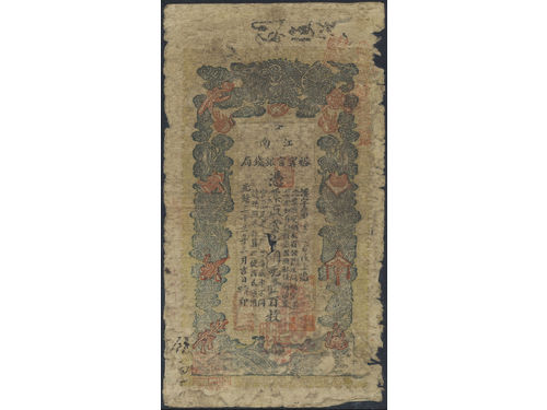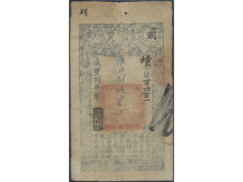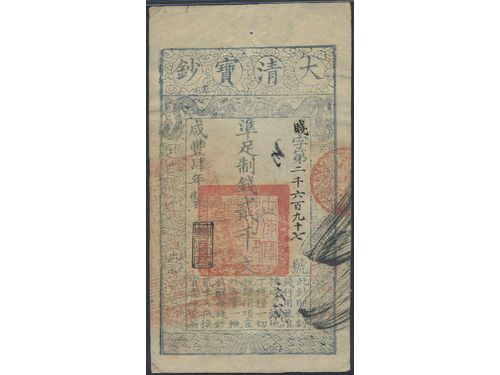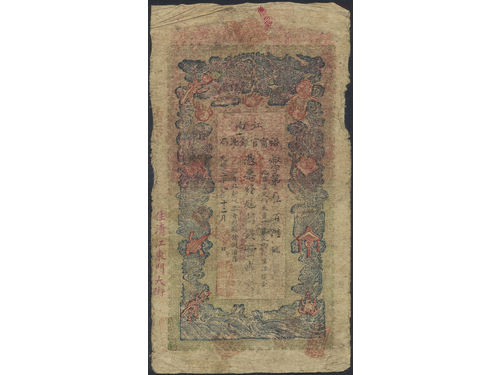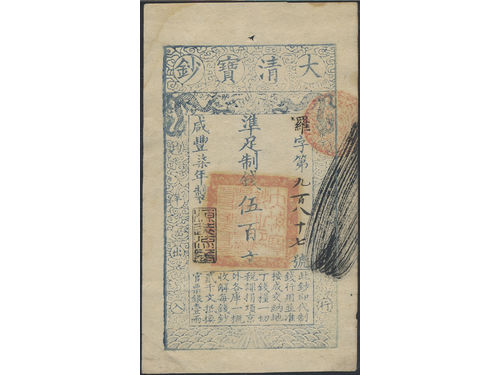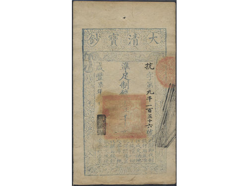 Banknotes, China - Empire. Pick A6d, 10000 cash Year 8 (1858). With re-issue stamp. Scarce issue of this high denomination. VF. Banknotes, China - Empire. Pick A6d, 10000 cash Year 8 (1858). With re-issue stamp. Scarce issue of this high denomination. VF. Visa mindre