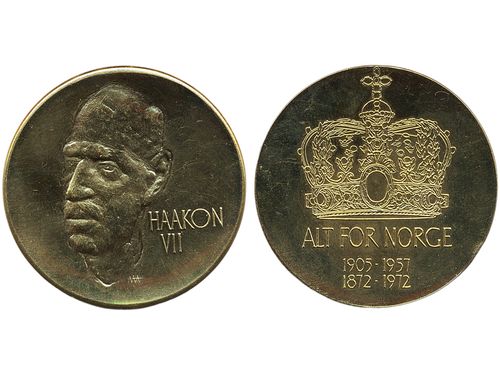 Medals, regal, Norway. Haakon VII, Gold medal (900/1000), 55.01 g, 40 mm in original box. Issued 1972, made at Kongsberg mint. 01. Medals, regal, Norway. Haakon VII, Gold medal (900/1000), 55.01 g, 40 mm in original box. Issued 1972, made at Kongsberg mint. 01. Visa mindre