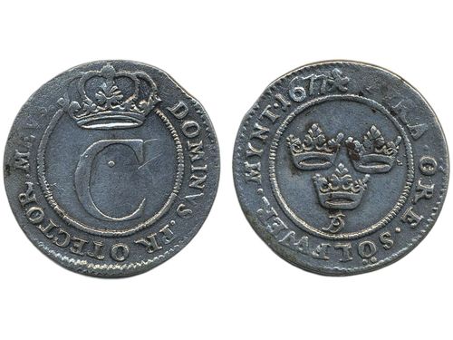 Coins, Sweden. Karl XI, SM 206, 4 öre 1677. 3.52 g. Stockholm. Minor edge clip from production. Small spots on reverse. Göhle 372. 1+. Coins, Sweden. Karl XI, SM 206, 4 öre 1677. 3.52 g. Stockholm. Minor edge clip from production. Small spots on reverse. Göhle 372. 1+. Visa mindre