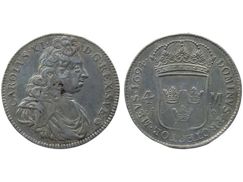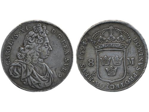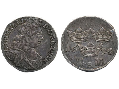 Coins, Sweden. Karl XI, SM 155, 2 mark 1694. 10.08 g. Stockholm. Well struck example with some lustre. 1+/01. Coins, Sweden. Karl XI, SM 155, 2 mark 1694. 10.08 g. Stockholm. Well struck example with some lustre. 1+/01. Visa mindre
