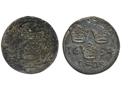 Coins, Sweden. Karl XI, SM 250, 1 öre 1694. 0.99 g. Stockholm. Light corrosion. 1+)(01. Coins, Sweden. Karl XI, SM 250, 1 öre 1694. 0.99 g. Stockholm. Light corrosion. 1+)(01. Visa mindre