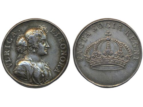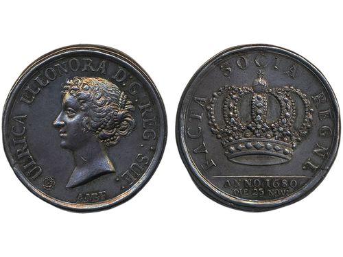 Medals, regal, Sweden. Karl XI, Hild. 8, Ulrika Eleonora d.ä. coronation medal 1680 by Meybusch. 19.02 g. 30 mm. Lustrous and beautiful example. 01. Medals, regal, Sweden. Karl XI, Hild. 8, Ulrika Eleonora d.ä. coronation medal 1680 by Meybusch. 19.02 g. 30 mm. Lustrous and beautiful example. 01. Visa mindre