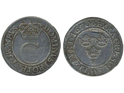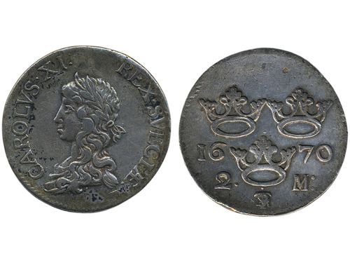 Coins, Sweden. Karl XI, SM 125b, 2 mark 1670. 9.76 g. Stockholm. Minor hairlines. Ex. Ahlström 57 lot 435. SMB 186. Göhle 634. 1+. Coins, Sweden. Karl XI, SM 125b, 2 mark 1670. 9.76 g. Stockholm. Minor hairlines. Ex. Ahlström 57 lot 435. SMB 186. Göhle 634. 1+. Visa mindre