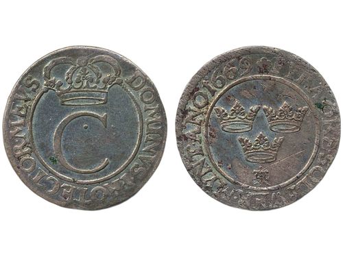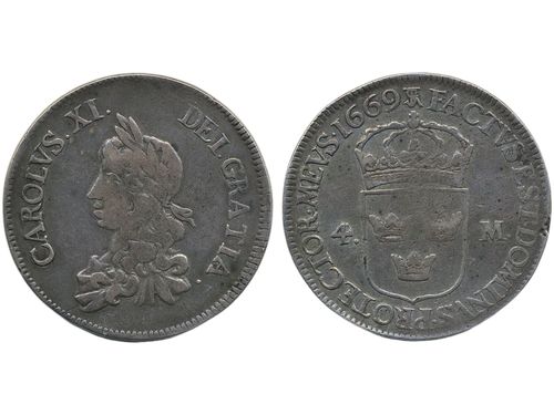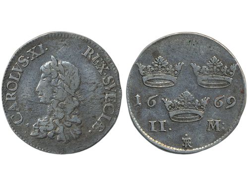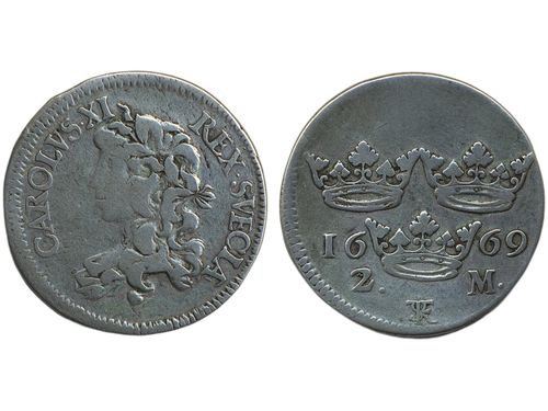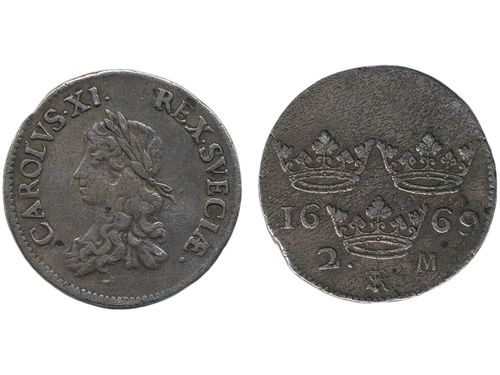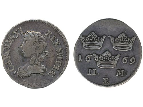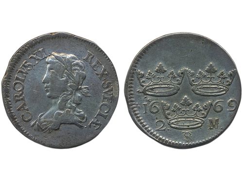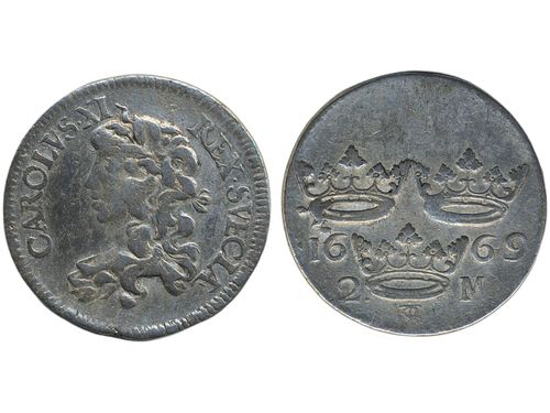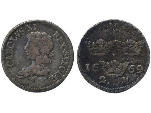 Coins, Sweden. Karl XI, SM 124a, 2 mark 1669. 10.40 g. Stockholm. Minor edge clip from production. SMB 178. Göhle 575. 1. Coins, Sweden. Karl XI, SM 124a, 2 mark 1669. 10.40 g. Stockholm. Minor edge clip from production. SMB 178. Göhle 575. 1. Visa mindre