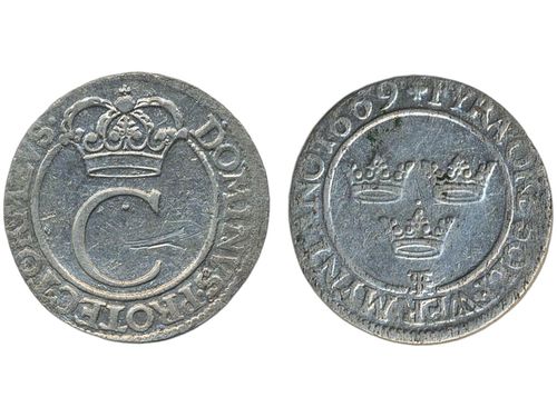 Coins, Sweden. Karl XI, SM 124a var, 2 mark 1669. 10.01 g. Stockholm. Minor edge irregularities from production. R. SMB 177. Göhle 590. 1/1+. Coins, Sweden. Karl XI, SM 124a var, 2 mark 1669. 10.01 g. Stockholm. Minor edge irregularities from production. R. SMB 177. Göhle 590. 1/1+. Visa mindre