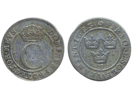 Coins, Sweden. Karl XI, SM 145 var, 2 mark 1684/3. 10.19 g. Stockholm. Mounted. Scarce overdate not mentioned in SM or SMB. Göhle 886. 1/1+. Coins, Sweden. Karl XI, SM 145 var, 2 mark 1684/3. 10.19 g. Stockholm. Mounted. Scarce overdate not mentioned in SM or SMB. Göhle 886. 1/1+. Visa mindre