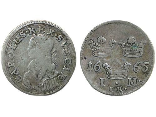 Coins, Sweden. Karl XI, SM 164a, 1 mark 1665. 4.41 g. Stockholm. Minor verdigris on reverse. RR. Ex. Myntkompaniet 31 lot 222. Göhle 17. 1. Coins, Sweden. Karl XI, SM 164a, 1 mark 1665. 4.41 g. Stockholm. Minor verdigris on reverse. RR. Ex. Myntkompaniet 31 lot 222. Göhle 17. 1. Visa mindre