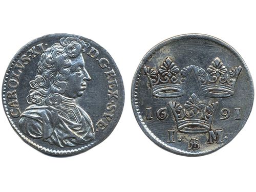 Coins, Sweden. Karl XI, SM 182, 1 mark 1691. Stockholm. Cleaned, reverse faint scratches. SMB 286. Göhle 94. 1+/01. Coins, Sweden. Karl XI, SM 182, 1 mark 1691. Stockholm. Cleaned, reverse faint scratches. SMB 286. Göhle 94. 1+/01. Visa mindre