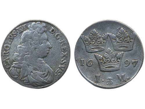 Coins, Sweden. Karl XI, SM 188, 1 mark 1697. 4.63 g. Stockholm. Scarce date. R. SMB 292. Göhle 123. 1)(1/1+. Coins, Sweden. Karl XI, SM 188, 1 mark 1697. 4.63 g. Stockholm. Scarce date. R. SMB 292. Göhle 123. 1)(1/1+. Visa mindre