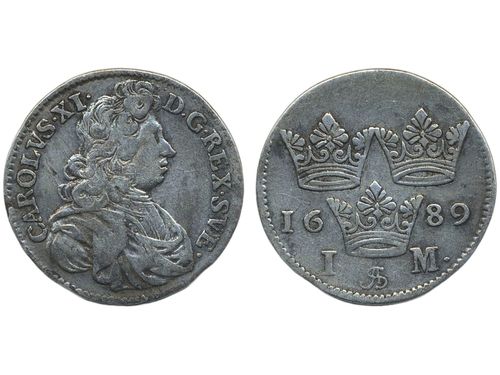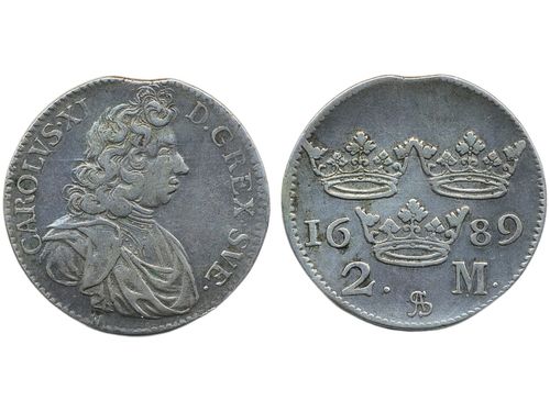Coins, Sweden. Karl XI, SM 150, 2 mark 1689. 10.30 g. Stockholm. Minor edge clip from production. SMB 232. Göhle 932. 1+. Coins, Sweden. Karl XI, SM 150, 2 mark 1689. 10.30 g. Stockholm. Minor edge clip from production. SMB 232. Göhle 932. 1+. Visa mindre