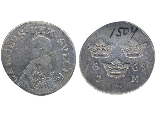 Coins, Sweden. Karl XI, SM 108d, 2 mark 1665. 9.54 g. Stockholm. Inventory number in ink on reverse. Ex. Törngren. RR. SMB 115. Göhle 227. 1. Coins, Sweden. Karl XI, SM 108d, 2 mark 1665. 9.54 g. Stockholm. Inventory number in ink on reverse. Ex. Törngren. RR. SMB 115. Göhle 227. 1. Visa mindre