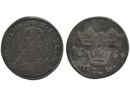 Coins, Sweden. Karl XI, SM 104a, 2 mark 1664. 9.62 g. Stockholm. Weakly struck obverse. R. SMB 109. Göhle 191. 1/1+. Coins, Sweden. Karl XI, SM 104a, 2 mark 1664. 9.62 g. Stockholm. Weakly struck obverse. R. SMB 109. Göhle 191. 1/1+. Visa mindre