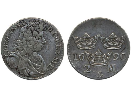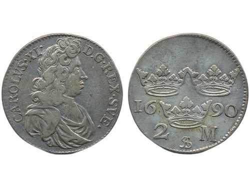 Coins, Sweden. Karl XI, SM 151, 2 mark 1690. 10.04 g. Stockholm. SMB 233. Göhle 941. 1/1+. Coins, Sweden. Karl XI, SM 151, 2 mark 1690. 10.04 g. Stockholm. SMB 233. Göhle 941. 1/1+. Visa mindre
