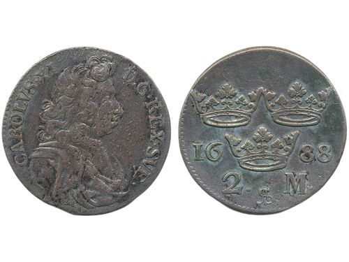 Coins, Sweden. Karl XI, SM 149, 2 mark 1688. 10.29 g. Stockholm. Some obverse corrosion. SMB 231. Göhle 927. 1/1+. Coins, Sweden. Karl XI, SM 149, 2 mark 1688. 10.29 g. Stockholm. Some obverse corrosion. SMB 231. Göhle 927. 1/1+. Visa mindre