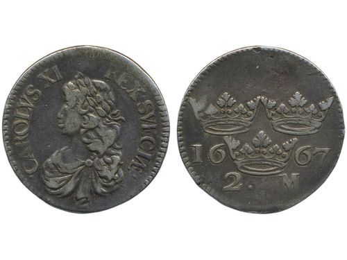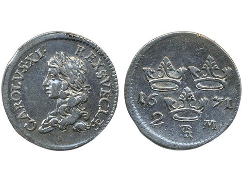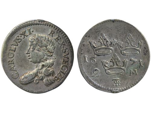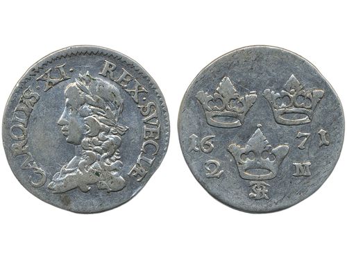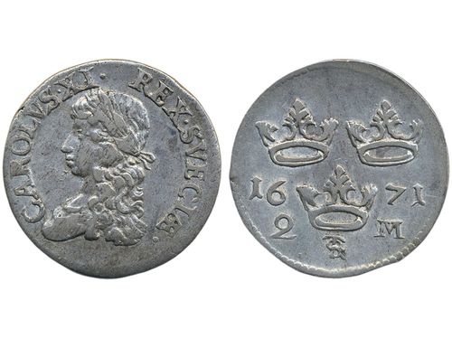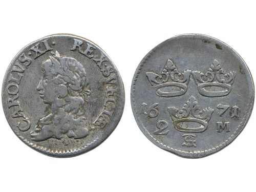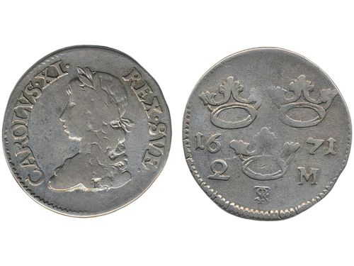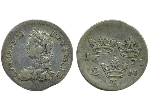 Coins, Sweden. Karl XI, SM 126a, 2 mark 1671. 10.35 g. Stockholm. Minor obverse corrosion. SMB 192. Göhle 708. 1/1+. Coins, Sweden. Karl XI, SM 126a, 2 mark 1671. 10.35 g. Stockholm. Minor obverse corrosion. SMB 192. Göhle 708. 1/1+. Visa mindre