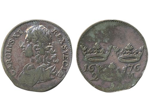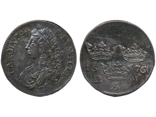 Coins, Sweden. Karl XI, SM 134a, 2 mark 1676. 10.17 g. Stockholm. Minor verdigris on obverse, reverse heavily scratched. R. SMB 209. Göhle 829. 1+. Coins, Sweden. Karl XI, SM 134a, 2 mark 1676. 10.17 g. Stockholm. Minor verdigris on obverse, reverse heavily scratched. R. SMB 209. Göhle 829. 1+. Visa mindre