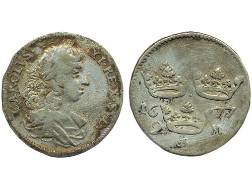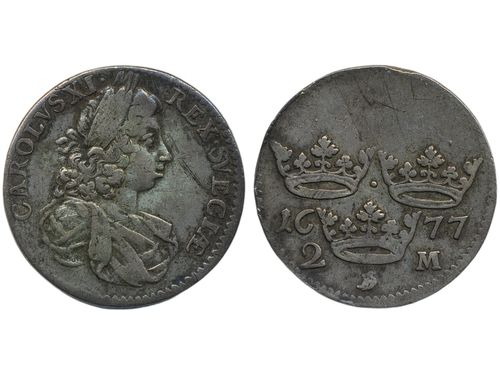 Coins, Sweden. Karl XI, SM 136b, 2 mark 1677. 10.18 g. Stockholm. Legend REX SVECIAE. Small scratches. Ex. Ahlström 25 lot 272. RR. SMB 216. 1/1+. Coins, Sweden. Karl XI, SM 136b, 2 mark 1677. 10.18 g. Stockholm. Legend REX SVECIAE. Small scratches. Ex. Ahlström 25 lot 272. RR. SMB 216. 1/1+. Visa mindre