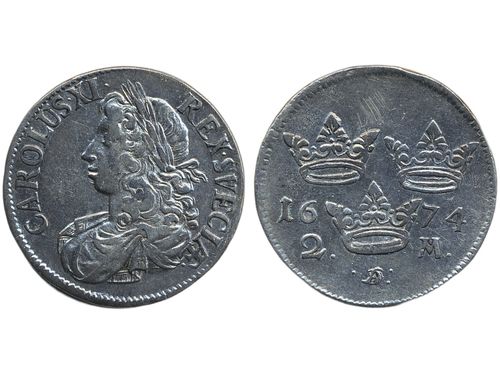Coins, Sweden. Karl XI, SM 132b, 2 mark 1674. 9.93 g. Stockholm. Cleaned. SMB 206. Göhle 803. 1+. Coins, Sweden. Karl XI, SM 132b, 2 mark 1674. 9.93 g. Stockholm. Cleaned. SMB 206. Göhle 803. 1+. Visa mindre