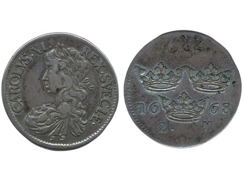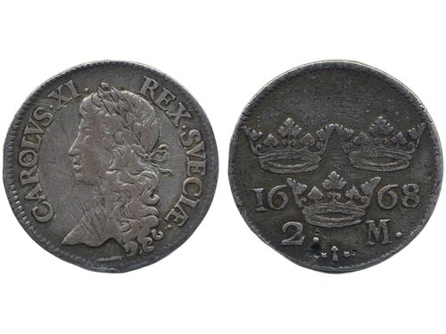 Coins, Sweden. Karl XI, SM 122, 2 mark 1668. 9.57 g. Stockholm. Minor obverse scratches. SMB 168. Göhle 517. 1+. Coins, Sweden. Karl XI, SM 122, 2 mark 1668. 9.57 g. Stockholm. Minor obverse scratches. SMB 168. Göhle 517. 1+. Visa mindre