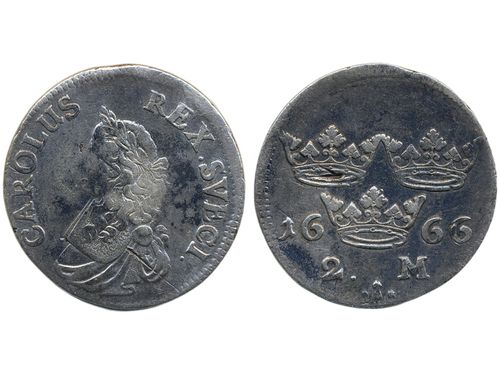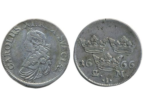 Coins, Sweden. Karl XI, SM 115a var, 2 mark 1666. 9.66 g. Stockholm. Legend REX SVECI – scarce! Obverse scratched, somew.. Läs mer Coins, Sweden. Karl XI, SM 115a var, 2 mark 1666. 9.66 g. Stockholm. Legend REX SVECI – scarce! Obverse scratched, somewhat weakly struck. RR. SMB 155. Göhle 366. 1/1+. Visa mindre