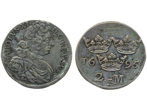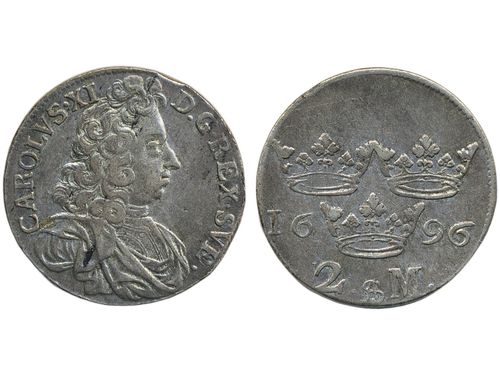 Coins, Sweden. Karl XI, SM 157, 2 mark 1696. 10.36 g. Stockholm. Lustrous example with minor edge clip from production... Läs mer Coins, Sweden. Karl XI, SM 157, 2 mark 1696. 10.36 g. Stockholm. Lustrous example with minor edge clip from production. Ex. MISAB 16 lot 881. SMB 239. Göhle 1082. 1+/01. Visa mindre
