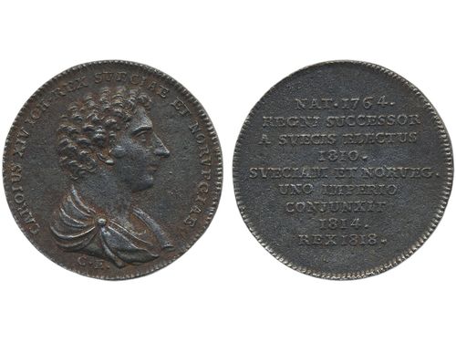 Medals, regal, Sweden. Karl XIV Johan, Hild. 23, Iron medal (some rust spots), 30 mm, 8.99 g. By Carl Enhörning. Obv: Bu.. Läs mer Medals, regal, Sweden. Karl XIV Johan, Hild. 23, Iron medal (some rust spots), 30 mm, 8.99 g. By Carl Enhörning. Obv: Bust facing right. Rev: Nine lines of text in latin: NAT.1764 REGNI SUCCESSOR A SVECIS ELECTUS 1810. SVECIAM ET NORVEG. UNO IMPERIO CONJUNXIT 1814. REX 1818. 1+. Visa mindre