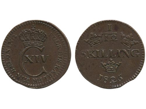 Coins, Sweden. Karl XIV Johan, SM 129, 1/12 skilling 1825. 2.27 g. Avesta. Minor edge clip from production. 01. Coins, Sweden. Karl XIV Johan, SM 129, 1/12 skilling 1825. 2.27 g. Avesta. Minor edge clip from production. 01. Visa mindre