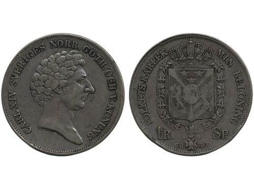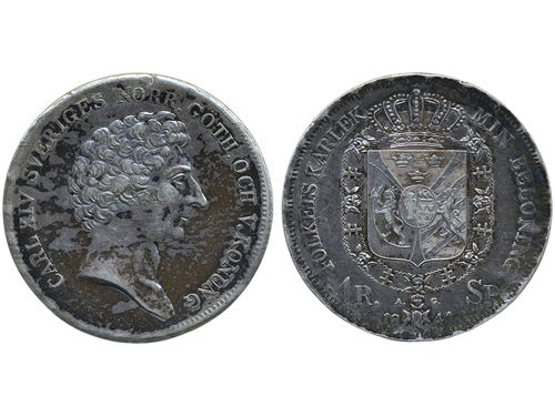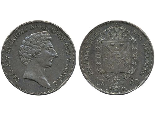 Coins, Sweden. Karl XIV Johan, SM 69, 1 riksdaler specie 1841. Obverse lightly cleaned, planchet flaw. Reverse lustrous and attractive. 1+/01)(01. Coins, Sweden. Karl XIV Johan, SM 69, 1 riksdaler specie 1841. Obverse lightly cleaned, planchet flaw. Reverse lustrous and attractive. 1+/01)(01. Visa mindre