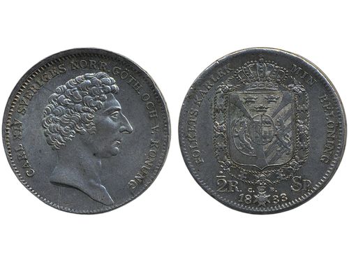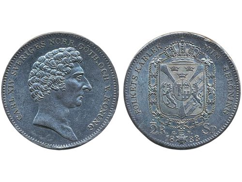 Coins, Sweden. Karl XIV Johan, SM 75, 1/2 riksdaler specie 1833. Lustrous example with two small obverse scratches. 1+/01. Coins, Sweden. Karl XIV Johan, SM 75, 1/2 riksdaler specie 1833. Lustrous example with two small obverse scratches. 1+/01. Visa mindre