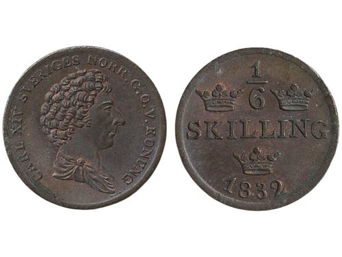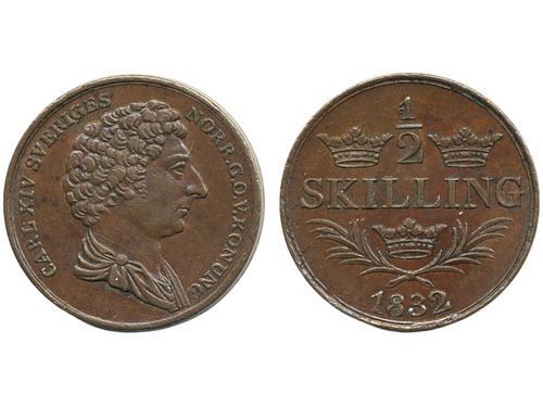 Coins, Sweden. Karl XIV Johan, SM 131, 1/2 skilling palmkvist 1832. 1+/01. Coins, Sweden. Karl XIV Johan, SM 131, 1/2 skilling palmkvist 1832. 1+/01. Visa mindre