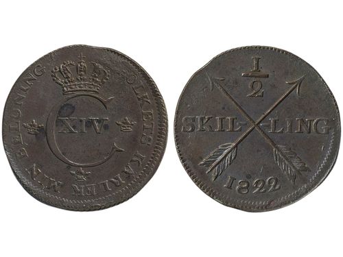 Coins, Sweden. Karl XIV Johan, SM 111a, 1/2 skilling 1822. 8.88 g. Avesta. Lustrous example. Minor edge clip from production. 01. Coins, Sweden. Karl XIV Johan, SM 111a, 1/2 skilling 1822. 8.88 g. Avesta. Lustrous example. Minor edge clip from production. 01. Visa mindre