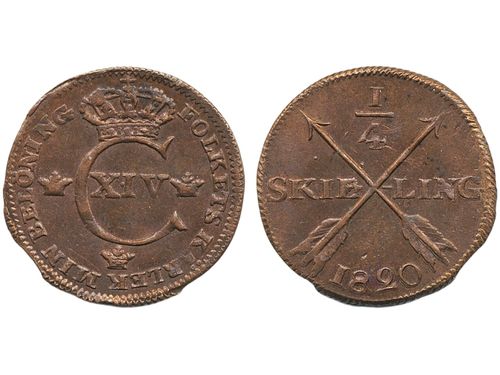 Coins, Sweden. Karl XIV Johan, SM 119, 1/4 skilling 1820. 3.88 g. Avesta. Beautiful example with much lustre. 01/0. Coins, Sweden. Karl XIV Johan, SM 119, 1/4 skilling 1820. 3.88 g. Avesta. Beautiful example with much lustre. 01/0. Visa mindre