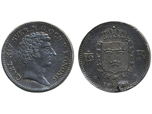Coins, Sweden. Karl XIV Johan, SM 186b, 1/12 riksdaler 1829. 4.40 g. Pattern coin with reverse planchet flaw are surface porosity. 1+. Coins, Sweden. Karl XIV Johan, SM 186b, 1/12 riksdaler 1829. 4.40 g. Pattern coin with reverse planchet flaw are surface porosity. 1+. Visa mindre