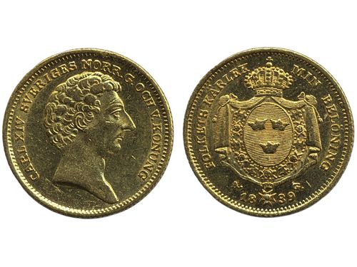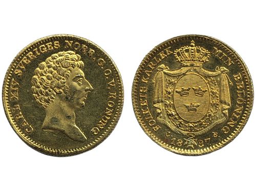 Coins, Sweden. Karl XIV Johan, SM 32, 1 dukat 1837. Lightly cleaned. Minor obverse digs on cheek. 1+/01. Coins, Sweden. Karl XIV Johan, SM 32, 1 dukat 1837. Lightly cleaned. Minor obverse digs on cheek. 1+/01. Visa mindre