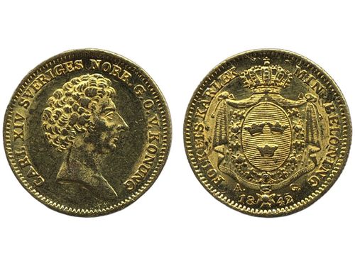 Coins, Sweden. Karl XIV Johan, SM 37, 1 dukat 1842. Lightly cleaned. 1+/01. Coins, Sweden. Karl XIV Johan, SM 37, 1 dukat 1842. Lightly cleaned. 1+/01. Visa mindre
