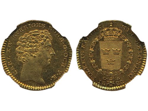 Coins, Sweden. Karl XIV Johan, SM 1, 4 dukater 1837. Graded by NGC as MS61 (only one higher). 01. See certification at NGC Coins, Sweden. Karl XIV Johan, SM 1, 4 dukater 1837. Graded by NGC as MS61 (only one higher). 01. See certification at NGC Visa mindre