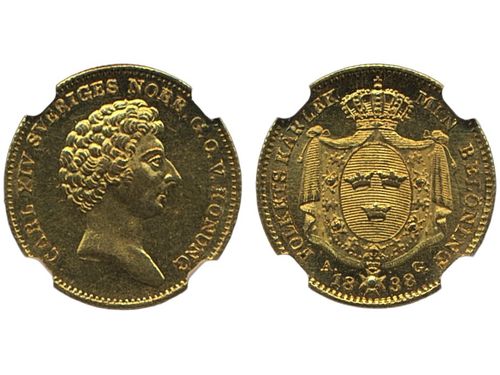 Coins, Sweden. Karl XIV Johan, SM 33, 1 dukat 1838. Graded MS62 by NGC. 01/0. Coins, Sweden. Karl XIV Johan, SM 33, 1 dukat 1838. Graded MS62 by NGC. 01/0. Visa mindre