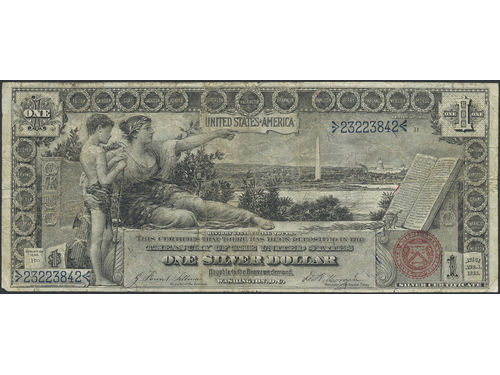 Banknotes, U.S.A. Pick 335, 1 dollar 1896. Minor tears. F. Banknotes, U.S.A. Pick 335, 1 dollar 1896. Minor tears. F. Visa mindre