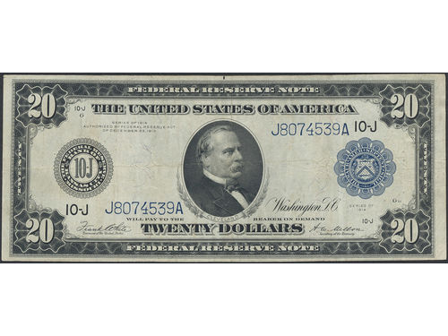 Banknotes, U.S.A. Pick 361b, 20 dollars 1914. Minor pinhole. F-VF. Banknotes, U.S.A. Pick 361b, 20 dollars 1914. Minor pinhole. F-VF. Visa mindre