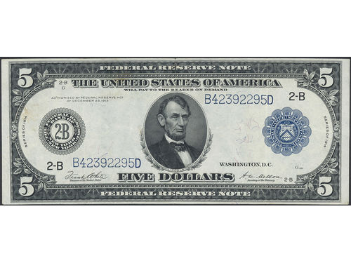 Banknotes, U.S.A. Pick 359b, 5 dollars 1914. VF. Banknotes, U.S.A. Pick 359b, 5 dollars 1914. VF. Visa mindre