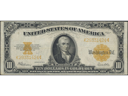 Banknotes, U.S.A. Pick 274, 10 dollars 1922. F-VF. Banknotes, U.S.A. Pick 274, 10 dollars 1922. F-VF. Visa mindre