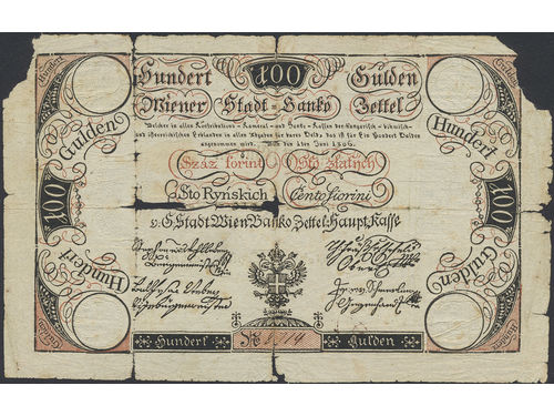 Banknotes, Austria. Pick A42a, 100 gulden 1806. No 8714. Corners missing and several holes. Nevertheless a very rare early issue. G-VG. Banknotes, Austria. Pick A42a, 100 gulden 1806. No 8714. Corners missing and several holes. Nevertheless a very rare early issue. G-VG. Visa mindre