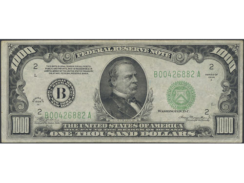 Banknotes, U.S.A. Pick 435a, 1000 dollars 1934 A. Centre fold and minor corner fold. Minor thinning on reverse. Scarce type note! VF-XF. Banknotes, U.S.A. Pick 435a, 1000 dollars 1934 A. Centre fold and minor corner fold. Minor thinning on reverse. Scarce type note! VF-XF. Visa mindre