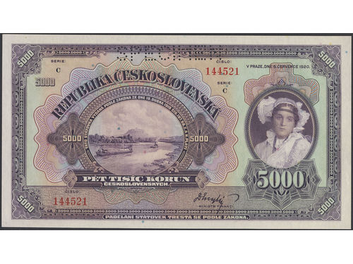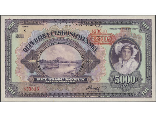 Banknotes, Czechoslovakia. Pick 19s, 5000 korún 1920. Punch cancelled SPECIMEN. UNC. Banknotes, Czechoslovakia. Pick 19s, 5000 korún 1920. Punch cancelled SPECIMEN. UNC. Visa mindre