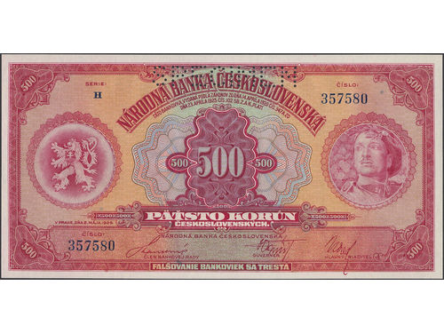 Banknotes, Czechoslovakia. Pick 24s, 500 korún 1929. Punch cancelled SPECIMEN. UNC. Banknotes, Czechoslovakia. Pick 24s, 500 korún 1929. Punch cancelled SPECIMEN. UNC. Visa mindre