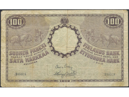Banknotes, Finland. Pick 13b, 100 markka 1909. No: 935078. First digit in serial number erased/altered. 1? Banknotes, Finland. Pick 13b, 100 markka 1909. No: 935078. First digit in serial number erased/altered. 1? Visa mindre